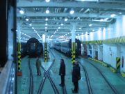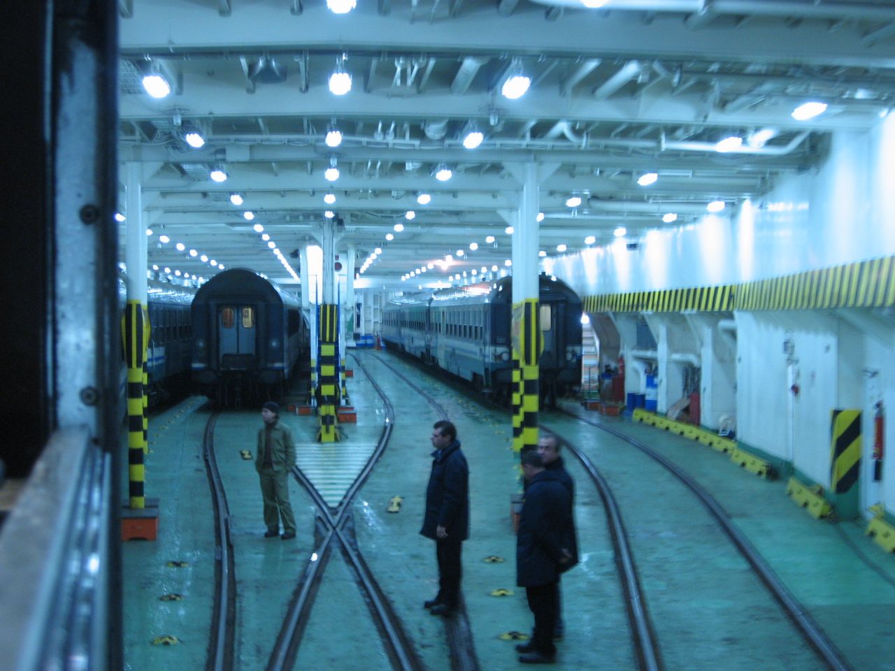 船内には線路が引かれています。そこへ3輌くらいづつ分けて、列車を積み込みます。