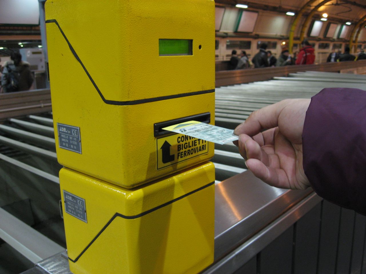 イタリアの鉄道駅には改札がありません。切符を買ったら、このような刻印機で日付をスタンプします。刻印がないと、罰金取られます。