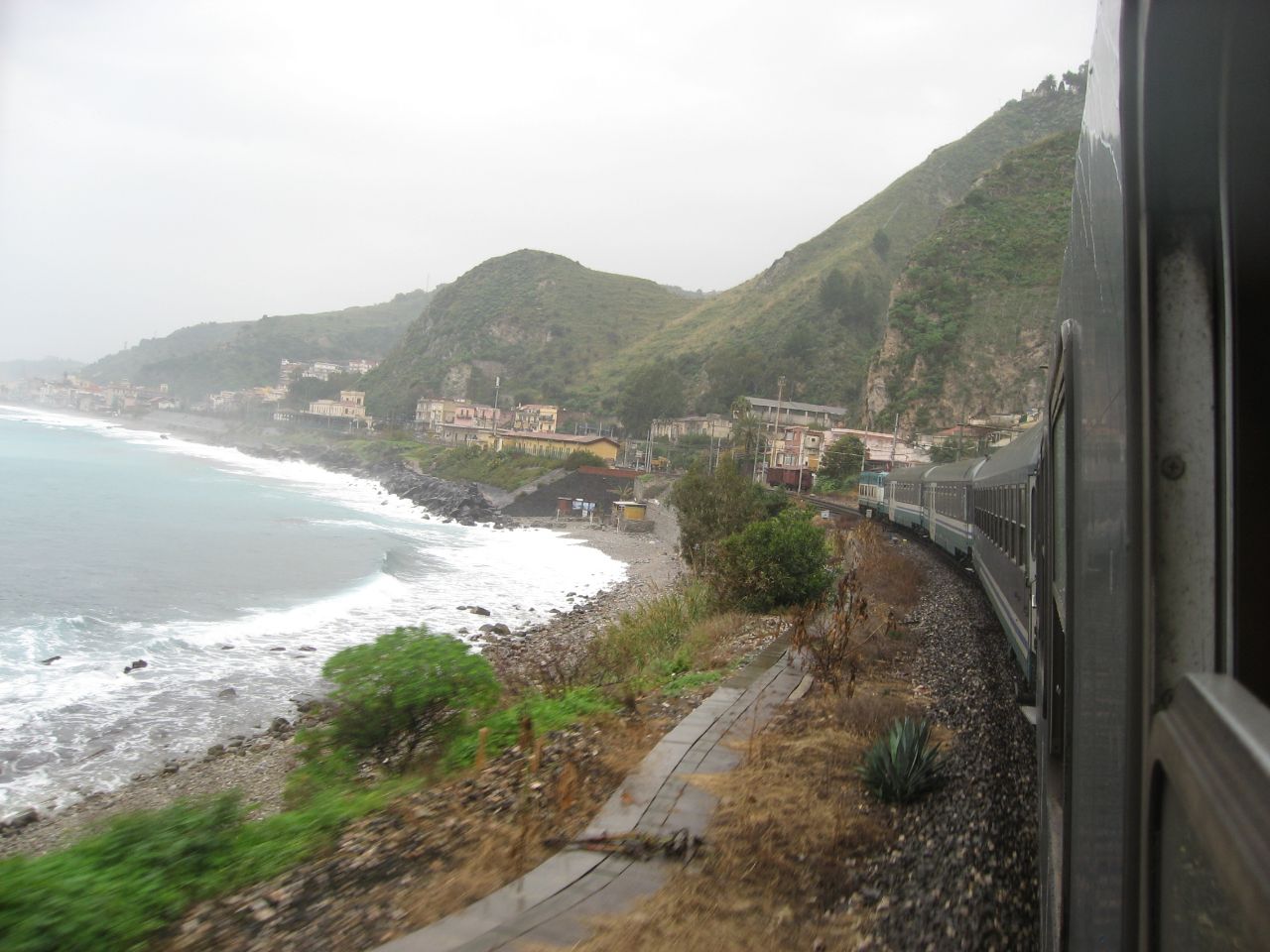 列車はシチリアの海岸沿いをひたすら走る。天気が良かったらもっと良いけど、気分は爽快。南はいいねー。気分がウキウキします。