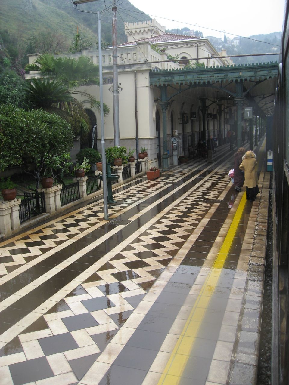映画「グラン・ブルー」でも有名な、シチリア屈指のリゾート、タオルミーナに到着。モザイク柄のホームがカワイイ。正確には、タオルミーナの中心地はここから急激な坂を登った高台にあります。