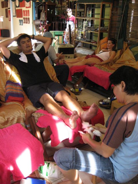 ものすごく歩いた後は、マーケット内の青空マッサージ。
