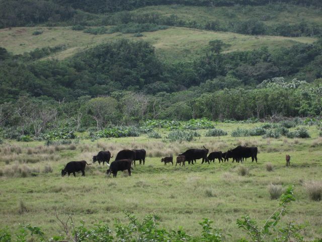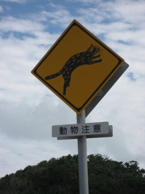 車道に飛び出して事故にあうことが多いらしく、島中注意の看板が立っています。だから車の制限時速も40キロ台。