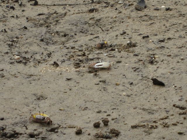 わかりますか?穴から顔をだした小さな白いシオマネキです。