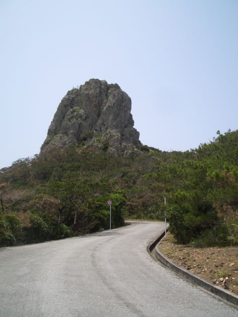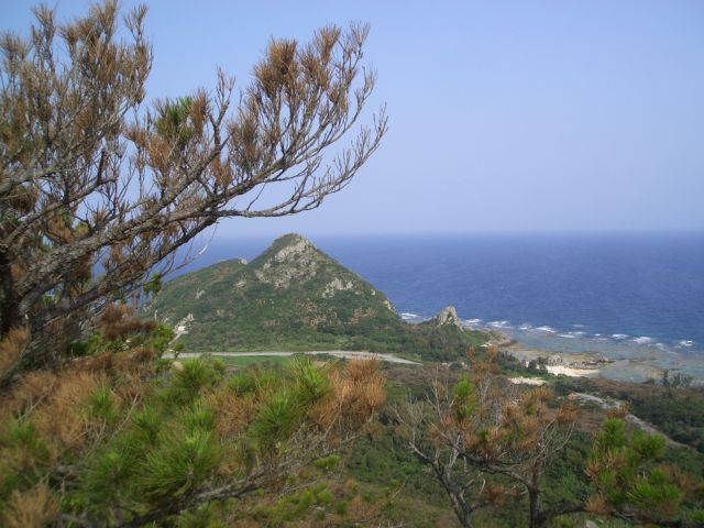 ピラミッド型の伊是名城跡が見えます。三方が海や絶壁という天然の要塞。