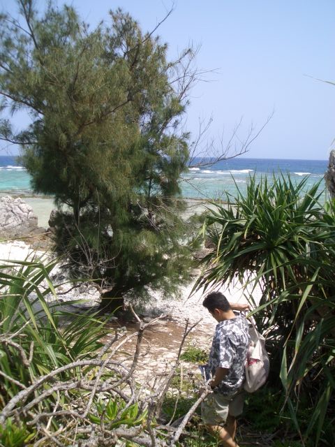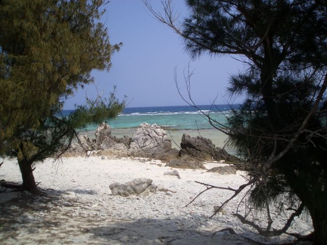 琉球松の間を抜けると、白い海岸と碧い海が開ける。