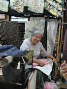 一人店舗が並んでいてオバアたちが反物を売っています。
