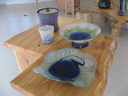 板間の床に並べられた作品。魅力的なブルーが美しい作品です。