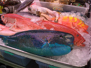 鮮魚の店も並びます。こんな色の魚ばかりで、ナイチャー(内地)の私たちには驚くばかり。