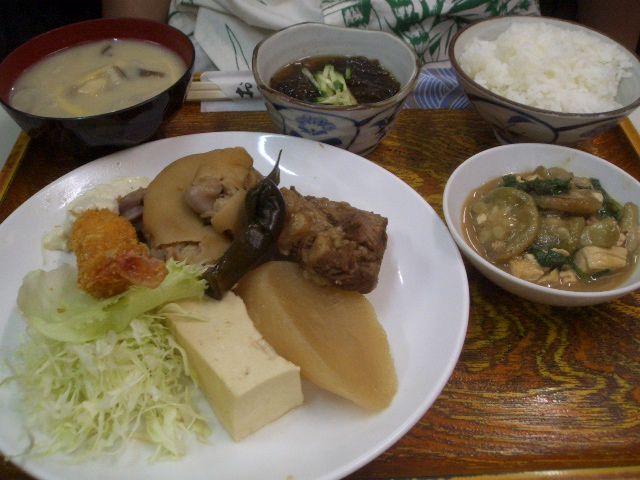 いろいろ沖縄食のメニューがあるけれど、これは店名を冠した大栄定食。てびち、ソーキ他盛りだくさんの定食です。イナムドゥチ(白味噌汁)も