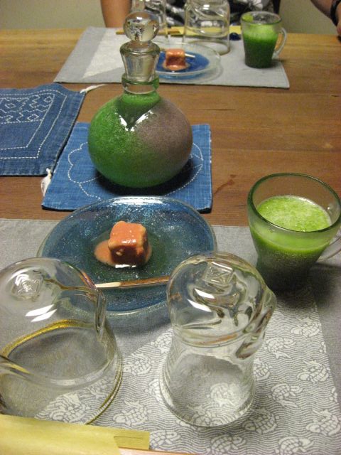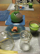 ステキな琉球ガラスのボトルで出てくるのは泡盛「春雨」です。春雨は女性にも呑みやすい泡盛で、呑んだ分だけ精算してくれます。