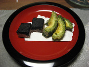 前菜のゴーヤてんぷらと豚の蒸し物に黒ゴマをのせたもの。