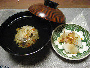 細かく刻んだ野菜やしいたけ、豚肉の炊き込みご飯。