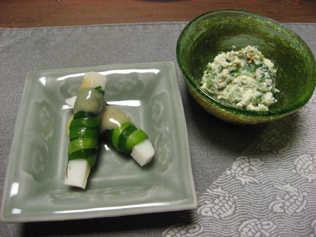 沖縄カステラかまぼこの青葱巻きと、ゴーヤの白あえ。