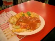 上にケチャップを掛けて食べます。おいしいけど私には少々油っこい。