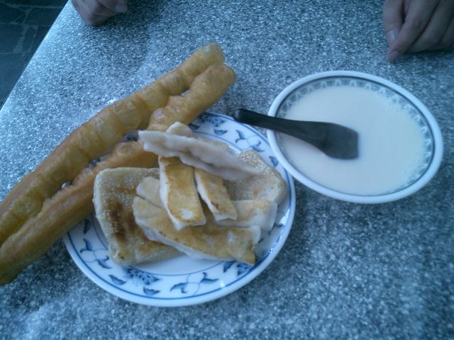 私たちは店に入って揚げパンと豆乳を頼んでみました。揚げパンを暖かい甘い豆乳につけながら食べる。