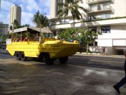 おぉっ!あれは噂の水陸両用車DUKW(ダック)、ダックツアーです。