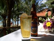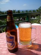 海を見ながらホテルレストランでビールの図。