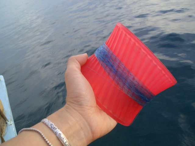 こんな簡単な仕掛けに、イカの切り身つけて糸たらすだけ。